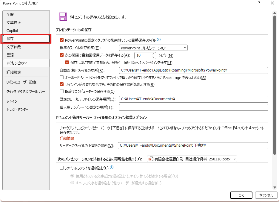 パワーポイントのフォント埋め込み方法 (常時設定)