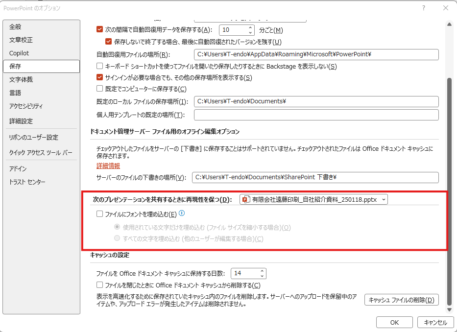 4.このプレゼンテーションを共有するときに忠実性を維持する、の項目でファイルにフォントを埋め込むをオンにする
