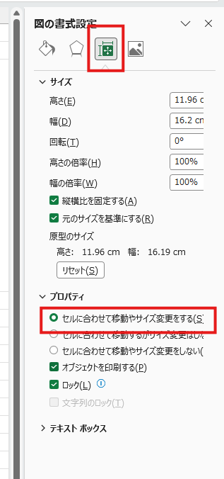2.「プロパティ」タブを押下。「セルに合わせて移動やサイズ変更をする」にチェックを入れます